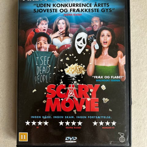 Scary Movie DVD film in comedy and horror genres. The DVD includes the full movie with a runtime and is suitable for viewers aged 14 and above. The cover features the main cast and promotional text highlighting the film's humorous and outrageous content.
