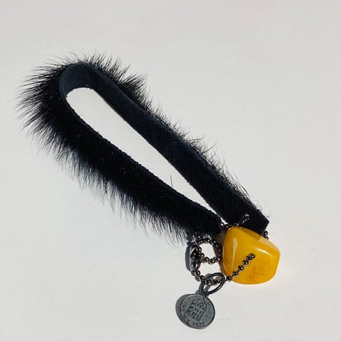 Armbånd i sort sælskind med kæde med vedhæng i cognac rav. Design fra House of Amber.