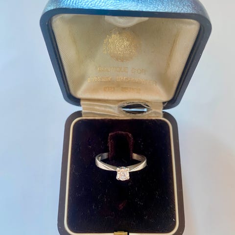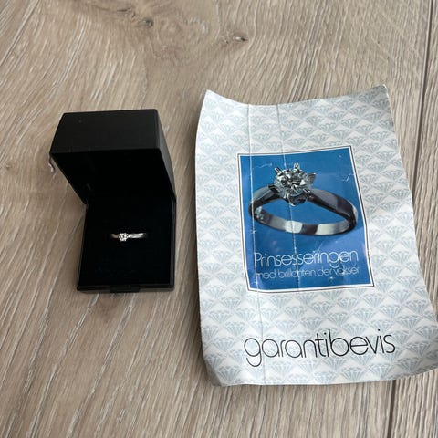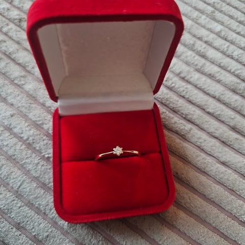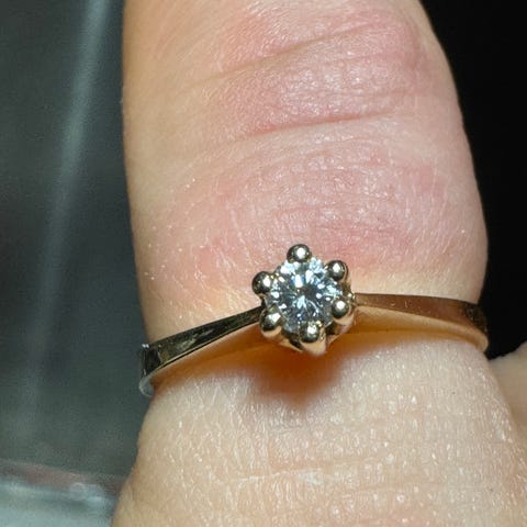 Jeg kender ikke karat på stenen, men den måler ca 2,5 mm i diameter.