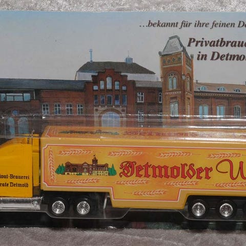 Lastbilen er brugt men fremstår som ny. Har kun være ude af øsken til fotografering. Skala er ukendt, men lastbilen er 110 mm lang, 45 mm høj og 30 mm bred. Vogntoget er 2100 mm lang. Leveres i original æske.