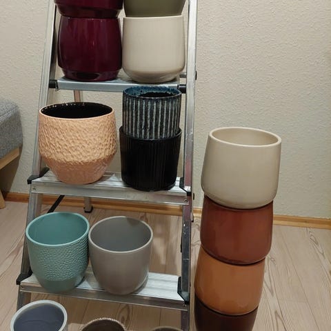 Ukendt mærke keramik plantekrukker sæt bestående af 2 stk. Farve: brun med dekorative mønstre. Materiale: keramik. Størrelse: den største krukke har en diameter på cirka 40 cm, den mindre cirka 30 cm. Begge krukker har drænhuller i bunden. Velegnet til udendørs brug til planter.