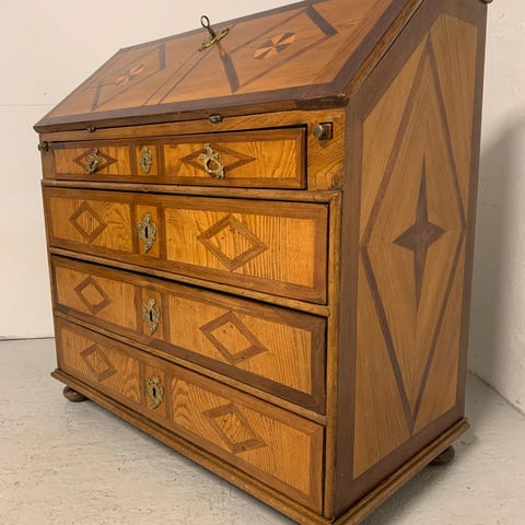Sekretær af rosentræ med intarsia af lyst træ. Bag cylinderklap er der 3 små skuffer og rum. Nederst 3 store skuffer. Praktisk til opbevaring og en stemningsskaber. Mål H: 98 cm, D: 45, L: 90.