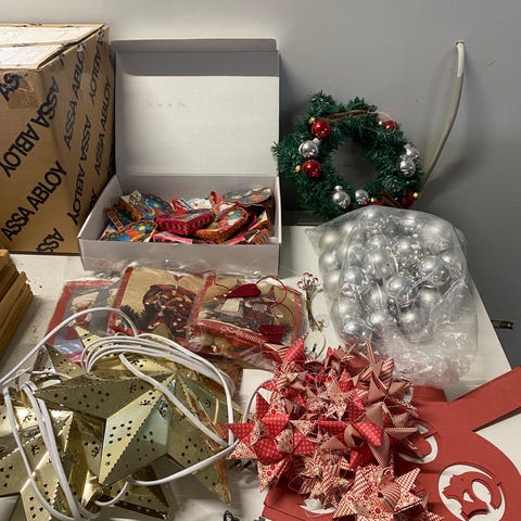 &Tradition Julepynt Jul Dekorationer i rød farve, lavet af stof og træmaterialer. Sættet indeholder forskellige julefigurer som nisser, hængende ornamenter og små dukker, velegnet til juledekoration i hjemmet. Materialerne og designet gør dem passende til indendørs brug i julesæsonen.
