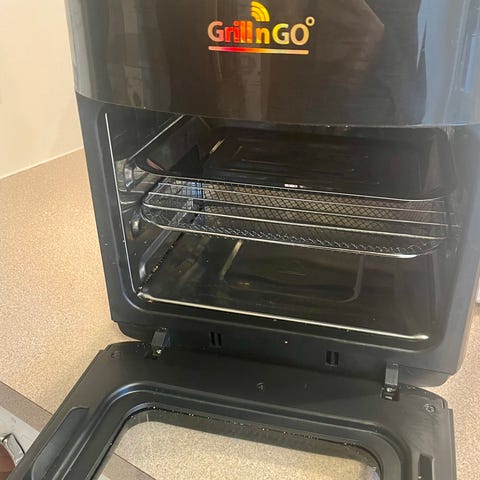 Grill'n GO Airfryer og Miniovn i sort farve. En kompakt køkkenmaskine med flere funktioner, herunder airfrying, bagning og stegning. Udstyret med en glasdør, trådrist og en bradepande, der gør det muligt at tilberede forskellige retter. Velegnet til mindre køkkener eller til hurtig madlavning.