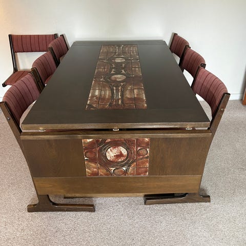 Pr. stol: 80,-, (så 6 stole: 480,-). Bord: 450,-.