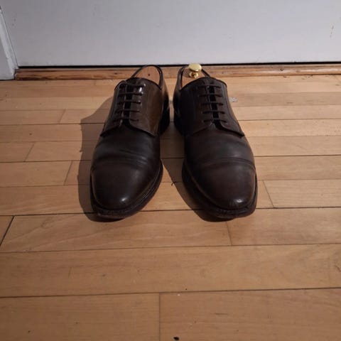 Skoene er brugt få gang og i flot og velholdt stand – Pudset og plejet. Indersåler samt foring er rene og intakte.