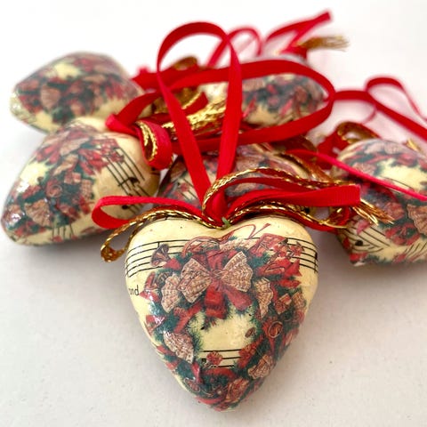 Hvert ornament har et rødt bånd med guldglimmer til ophængning.