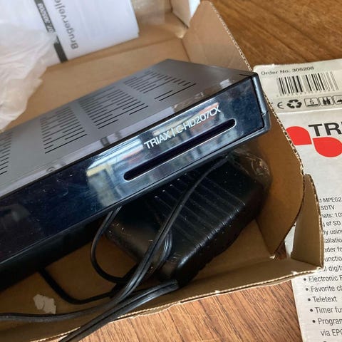 Triax C-209cx kabelmodtager med tilhørende manualer. Enheden er designet til at modtage kabel-tv signaler og har flere porte til tilslutning. Produktet er sort og kompakt, velegnet til hjemmebrug.