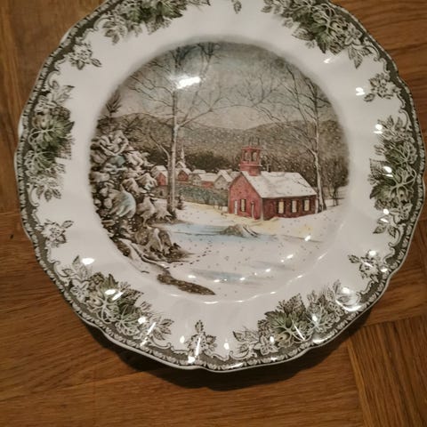 Johnson Bros The Friendly Village smukke tallerken sæt i porcelæn med forskellige motiver i landskabsdesign. Fremstillet i England, indeholder 5 frokost tallerkener (ens motiv) og 6 middags tallerkener med forskellige landskabsmotiver.