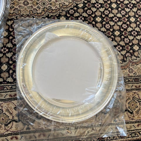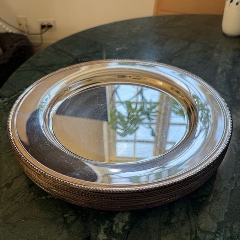 12 styk sølvplet dækketallerkner med perlekant. Diameter 28 cm. Brugsspor på et par stykker.