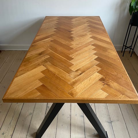 Spisebord med sildebensmønster og sorte træben Årsag til outlet: Uden emballage. Ridser og mærker på bordpladen samt mindre mærker på ben. Et smukt og funktionelt spisebord der kombinerer klassiske detaljer med moderne kontraster. Den lakerede bordplade i egefiner har et elegant sildebensmønster, der tilfører varme og struktur til rummet, mens de sorte træben giver et stilrent og nutidigt udtryk. Tillægsplader Bordet måler 200 cm i længden og giver god plads til seks spisebordsstole – tre på hver side. Har du brug for ekstra plads, er bordet forberedt til tillægsplader, som nemt kan tilføjes i hver ende. Hver plade forlænger bordet med 45 cm, så du samlet kan opnå en længde på op til 290 cm. Bordet fås i to varianter: lys egefiner og røget egefiner – så du kan vælge det look, der passer bedst ind hjemme hos dig. Et ideelt valg til både hverdag og gæster med mulighed for at tilpasse efter behov.