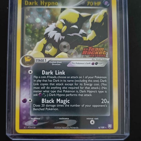 Pokémon Dark Dragonite samlekort med 120 HP. Kortet er en del af Team Rocket Returns-serien og har angrebene Double Wing Attack og Claw Swipe. Kortet er indkapslet i en beskyttende holder for bevarelse og visning.