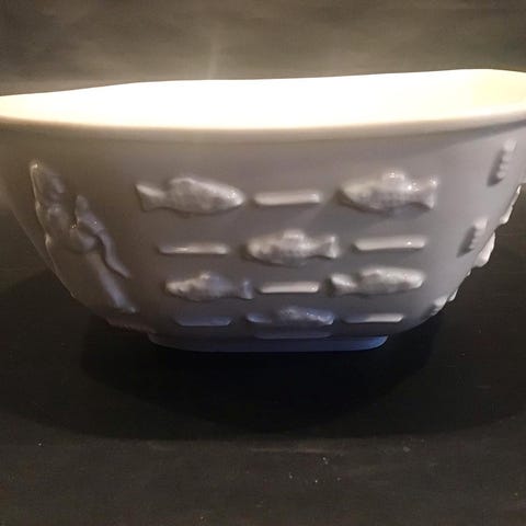 Bode Willumsen for Royal Copenhagen - en Blanc de Chine skål med fiskemotiver i relief. Skålen har nr. 4085, og den måler 10,5 x 27,5 x 25cm. Den er 1. sortering og fremstår i perfekt stand.