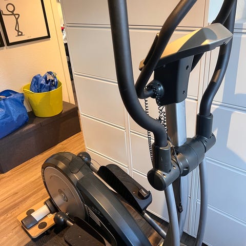 Kettler elliptisk træner med digital display, der viser tid, hastighed og distance. Træneren har håndtag med pulsmåling og fodpedaler til træning af hele kroppen. Passer til hjemmebrug og giver mulighed for konditions- og styrketræning.