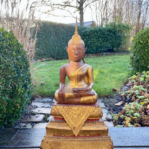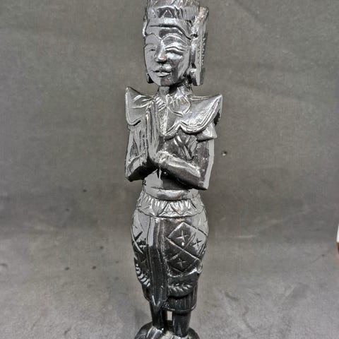 Burmesisk teaktræ, motiv: Buddhas tempelvogtere, To meget smukke og håndværksmæssigt veludførte Buddistiske Tempelvogtere fra Burma 1860-1880. Den ene med tørrevne i ene side, se foto. Højde 58 cm. Bredte ved sokkel 26 cm. Dybde ved sokkel 36 cm. De vejer 11 og 12 kg og er skåret i teaktræ. Pris er for begge to.