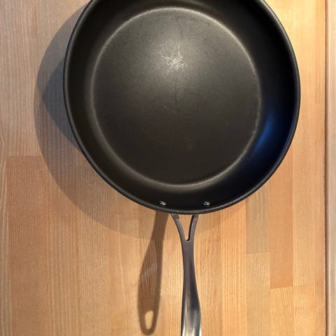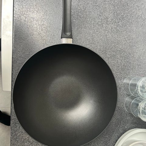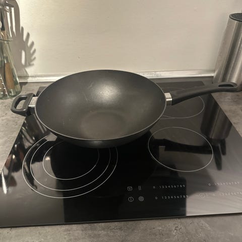 med en diameter på 29 cm, sort belægning og metalhåndtag. Stegepanden kommer med et glaslåg med metalkant og håndtag. Den er velegnet til at stege og lave mad på komfuret. Brugt én gang.
