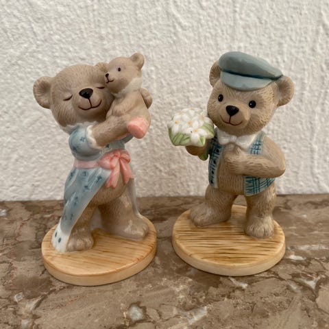 Victoria bamsefigur i keramik, cirka 7 cm høj. Figuren forestiller en bamse i blå kjole med lyserødt bånd, der holder en mindre bamse. Del af The Bing & Grøndahl Teddy Bear Collection, modelåret 2000.
