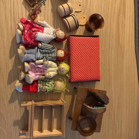 Dukkehus-tilbehør, Ældre legetøjs Telefon, lampe og div køkkenting i metal