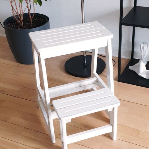 Taburet/trappestige/trappeskammel med indklappelig trin,stel i guncoatet metal,sæde og trin i massiv teaktræ.