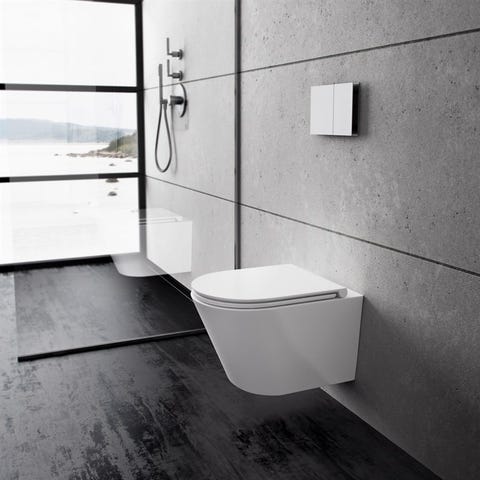 Pulcher® Nomi PN2-18 væghængt toilet med Rimless skyl. Blankhvid porcelæn med EasyClean Coat glasur. Mål: 49d x 36b x 36h cm. Toiletsæde og betjeningspanel medfølger ikke.