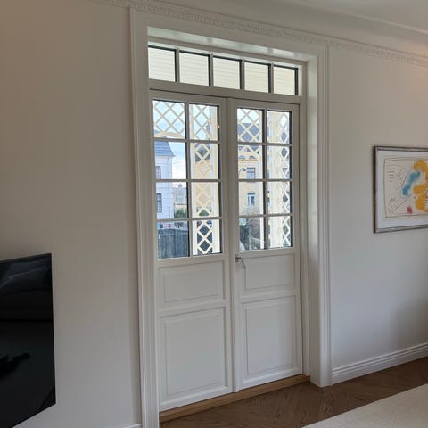 Indendørs dobbeltdør med flere glaspartier i hvidt træ. Døren består af to paneler med øverste del opdelt i mindre glasvinduer, som tillader naturligt lys at passere. Velegnet til opdeling af rum, hvor lysgennemstrømning ønskes bevaret.