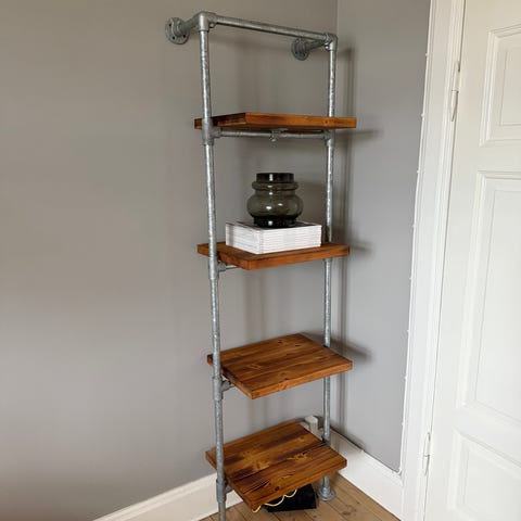 Fed, rustik reol med vandrør og 3 hylder i mørkbejdset træ.