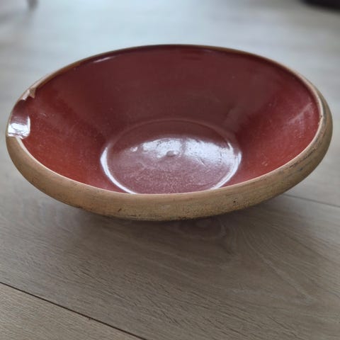 Rundt lerfad formentlig hjemme malet i 1958, kanten rundt er ok.