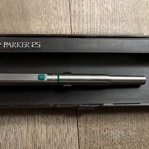 Parker 51 fra 1950–60’erne. Sort krop og “Rolled Gold” hætte. Aero-model med hooded nib.