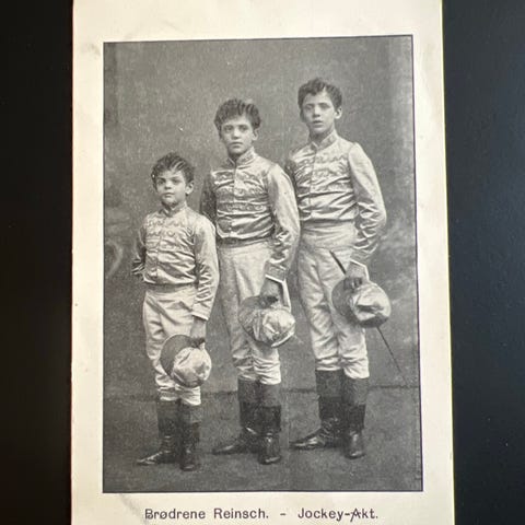 Vintage postkort med illustration af en familie bestående af en mand, kvinde og barn i en ikke politisk korrekt situation. Postkortet er trykt med tekst på flere sprog, herunder tysk og andre europæiske sprog.