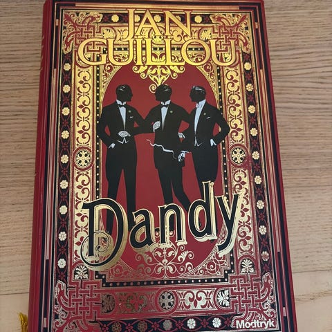 Jan Guillou Dandy er en bog med rød omslag og dekorative sorte og guld detaljer. Bogen er på dansk og indeholder tekst trykt på almindeligt papir. Den har en indbygget bogmærkesnor i gul farve. Bogens dimensioner og antallet af sider er ikke specificeret i billederne.