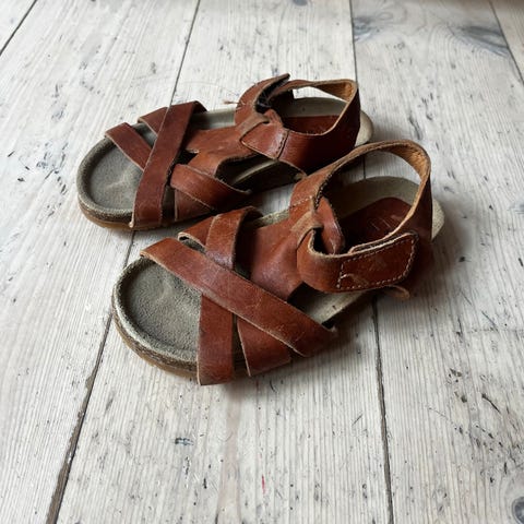 Sandaler, str. 32, Bisgaard, piger, SOM NYE. De flotteste skindsandaler i brunt og grønt. Også skind indvendigt med bløde polstringer i hele sålens længde, som giver god komfort. Forreste del er udformet smukt som blade. Indvendig længde er ca. 20,6 cm (det er målet på skindsålen fra top til tå på det grønne stykke). I superflot stand, kun brugt til fint brug få gange og ingen mærker på den grønne indvendige sål af brug. Nypris 600 kr. Kan sendes til køber. Køber betaler fragt.