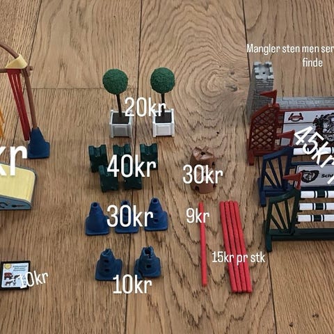 Tjek min profil i løbet af ugen eller skriv til mig da jeg har en masse schleich der kommer til salg. Har alt fra stalde til huse til stævnebaner til trailere og biler. Skriv en pb for flere billeder eller vi kan aftale mængerabat. :)