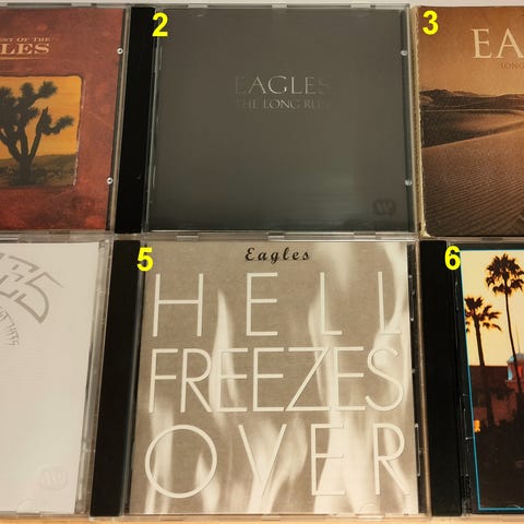 Eagles Hell Freezes Over DVD. Sort/hvid cover med tekst og illustration. Indeholder liveoptrædener og sange fra bandet Eagles. 99 minutter.
