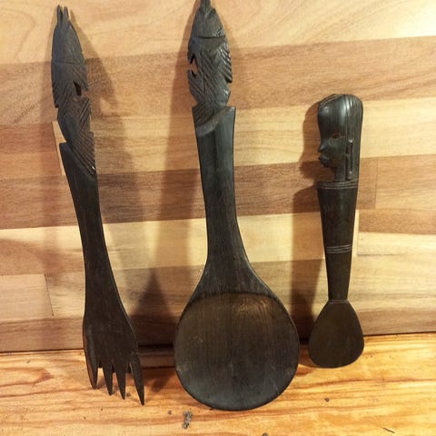 Håndlavet træ salatbestik sæt bestående af en stor ske og gaffel. Bestikket er lavet af mørkt træ og har et langt håndtag med dekorative udskæringer. Velegnet til servering af salat og andre retter, 39 cm.