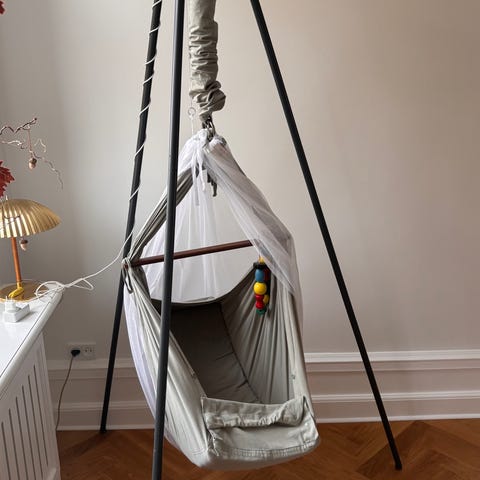 Sengehimmel til slyngevuggen (denne har et lille hul i syningen. Burde kunne fikses. Se billede)