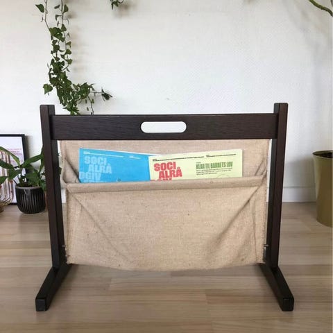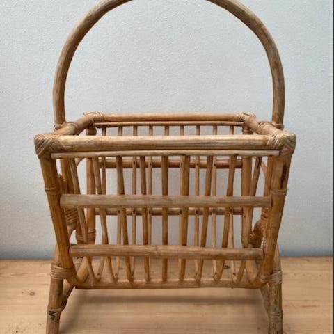 Gammel men fin magasin holder i bambus. Er blevet brugt til bøger i læsehjørnet. Har lidt skønhedsfejl men er god og stabil.