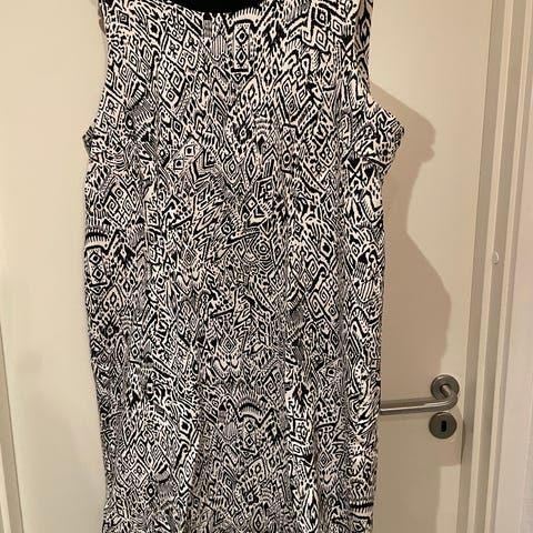Janina Hverdagskjole i størrelse 38 med sort og hvid leopardmønstret design. Kjolen er uden ærmer og har en rund halsudskæring med en lille åbning bagpå. Materialet er let og velegnet til hverdagsbrug.Stand som ny Sender gerne dog ikke som Fiks og færdig