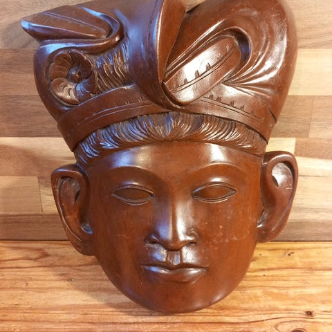 Håndskåret træmaske med afrikansk design. Masken er lavet af mørkt træ og har detaljerede udskæringer, herunder markante ansigtstræk og dekorative elementer. Masken er velegnet til vægophæng som dekorativt element, 31 cm høj