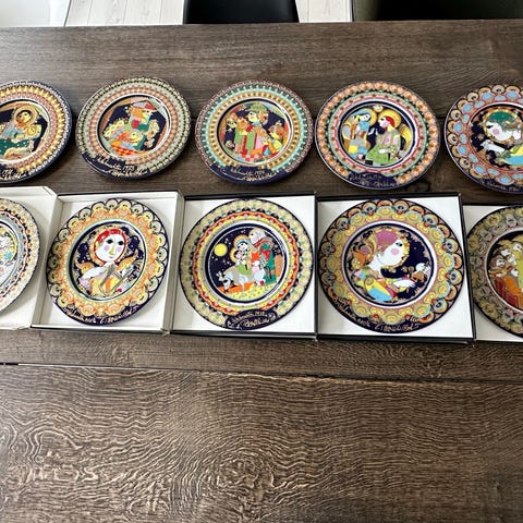Vildt smukke juleplatter - år 1976-77-78-79-80 - kan bruges som dækketallerkener, middagstallerkener eller som pynt på væggen.