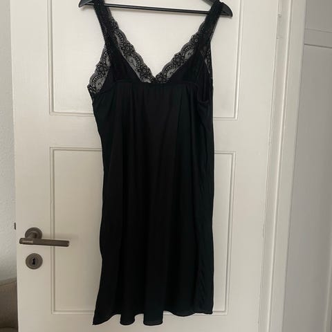 En transparent sort kjole, til at have på over en underkjole, basis kjole eller lignende. Har lange ærmer, et flagrende løst skørt og mulighed for at binde en lille sløjfe ved halsen.