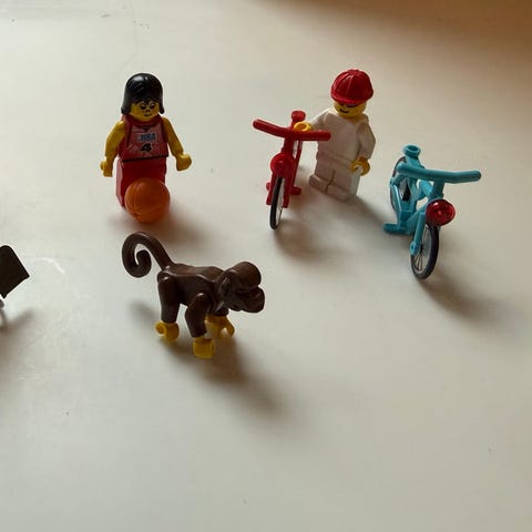 LEGO City sæt med forskellige minifigurer, små bygninger og tilbehør. Indeholder blandt andet en pink båd, popcornvogn og forskellige figurer i forskellige farver og tøjstilarter. Materialet er plastik, og sættet er velegnet til børn og samlere.