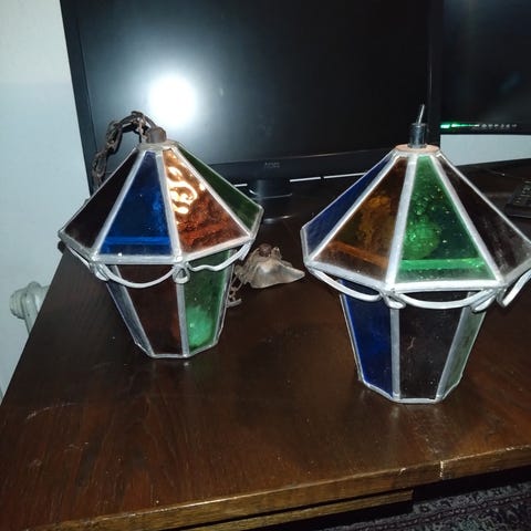 Flot lampe med blyindfattet glas i flotte farver blå/gul/ grøn/rød