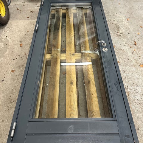 Dør i almue-stil i massivt fyrretræ med stort glasparti.