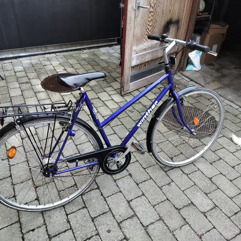 Winther damecykel, stel 50 cm, hjul/dæk 28", 7 indv. gear, håndbremse for, fodbremse bag, ny stor indkøbskurv, lav indstigning, dejlig oprejst kørestilling, nyserviceret.
