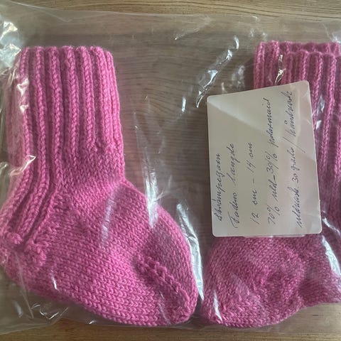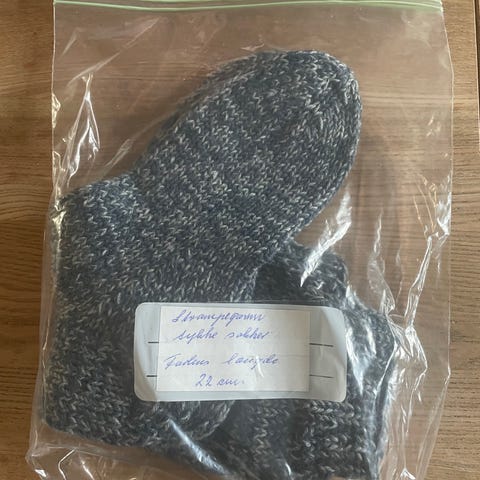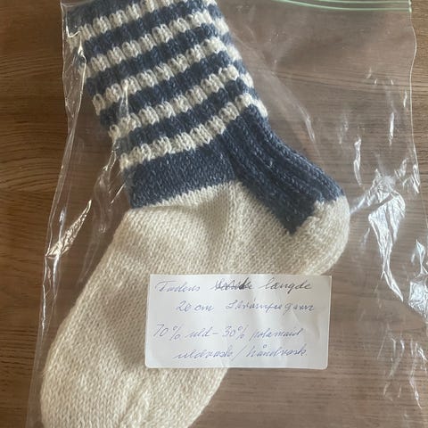 Hjemmestrikket sokker. Fodlængde 20 cm.