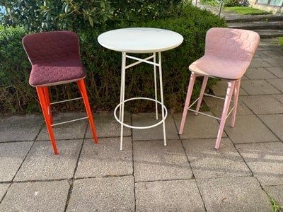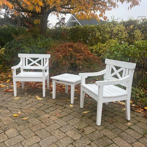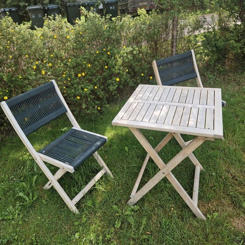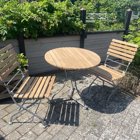 Flot cafesæt i teaktræ, bestående af 1 bord og 2 stole med tilhørende sorte hyndesæt.