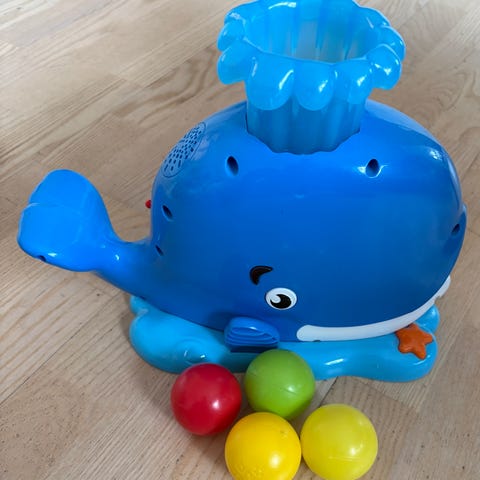 Skøn hval fra B toys med lys og lyd. Når man trykker på stjerneknappen lyser den og spiller forskellige sange, samtidig med at det skyder de fem farvestrålende bolde ud og over i munden på fisken som udgør en “spiralrutchebane” som fører den tilbage til maven hvor de skydes ud igen. Man kan også vende åndehullet så boldene skydes ud på gulvet og barnet skal kravle efter dem. Den kører på batteri, men kan også køre på strøm gennem et mini USB-stik.