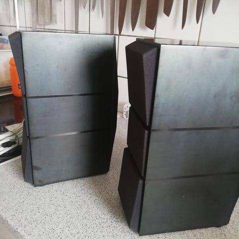 Bang & Olufsen højttalersæt i sort farve bestående af to høje gulvhøjttalere og fire mindre højttalere. Materiale og specifikke mål er ikke angivet. Designet til lydafspilning i hjemmemiljø.