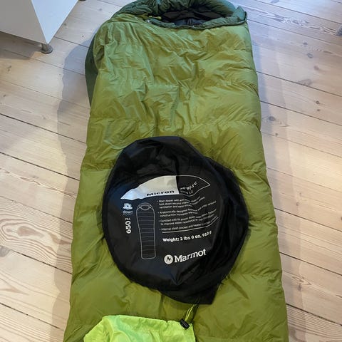 Virkelig lækker, let og varm dun sovepose fra Marmot. Som ny, ingen pletter. Kun brugt 1 gang på en bestigning i Nepal og ellers opbevaret tørt og varmt. Fungerer godt helt ned i -25 grader (testet i Nepal). Mange gode funktioner med varm indbygget hoodie. Opbevaringspose og komprimeringspose medfølger.