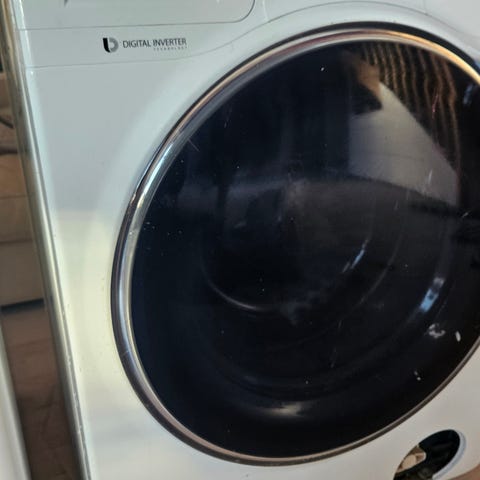 Samsung Andet vaskemaskine i hvid farve. Frontbetjent model med elektronisk display og drejeknap til programvalg. Energiklasse A. Designet til almindelig husholdningsbrug.